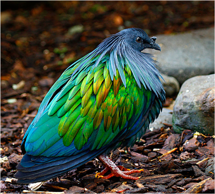 Các Nicobar Pigeon (Caloenas nicobarica) là một chim bồ câu được tìm thấy trên hòn đảo nhỏ và các vùng ven biển từ quần đảo Nicobar, phía đông thông qua quần đảo Mã Lai, đến Solomons và Palau. Nó là thành viên duy nhất còn sống của Caloenas chi. Đây là một con chim lớn, rộng 40 cm chiều dài. Người đứng đầu có màu xám, như bộ lông cổ trên, mà biến thành màu xanh lá cây và đồng hackles về phía ngực. Vú và remiges có màu xám tối. Đuôi rất ngắn và màu trắng tinh khiết. Phần còn lại của bộ lông của nó là kim loại màu xanh lá cây. Các cere của dự luật tối tạo thành một núm đen nhỏ, chân và bàn chân mạnh mẽ có màu đỏ ngu si đần độn. Các irides tối. Con cái là hơi nhỏ hơn so với nam giới, họ có một núm nhỏ hơn hóa đơn, hackles ngắn hơn và phần dưới vàng thêm. Chim non có một cái đuôi đen và thiếu gần như tất cả các màu ánh kim. Hầu như không có bất kỳ sự thay đổi trên những con chim nhiều.